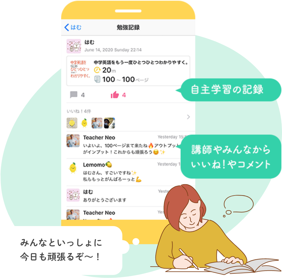 みんなで同じテキストを使って自主学習をします。アプリに学習記録をするとみんなから”いいね!”やコメントがもらえて、モチベーションがアップ!