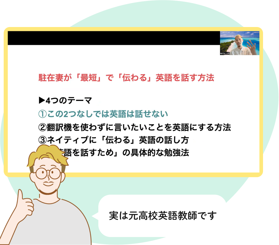 「英語が話せたらもっと駐在生活を楽しめるのになぁ」と思い悩む駐在妻を、3年間で150人以上を救い続けてきたNEO先生。英語力ゼロや英語アレルギーの駐在妻を対象に、たった3ヶ月で"ペラペラではないが"英語が話せるようになるレッスンを現在も実施中。(レッスン満足度は95%超え)